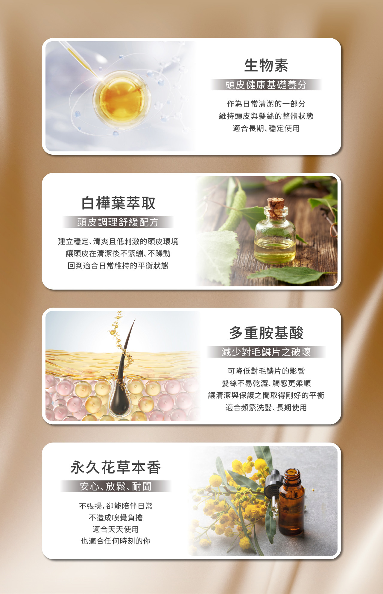 • 多重胺基酸 減少毛鱗片破壞 髮絲不易乾澀